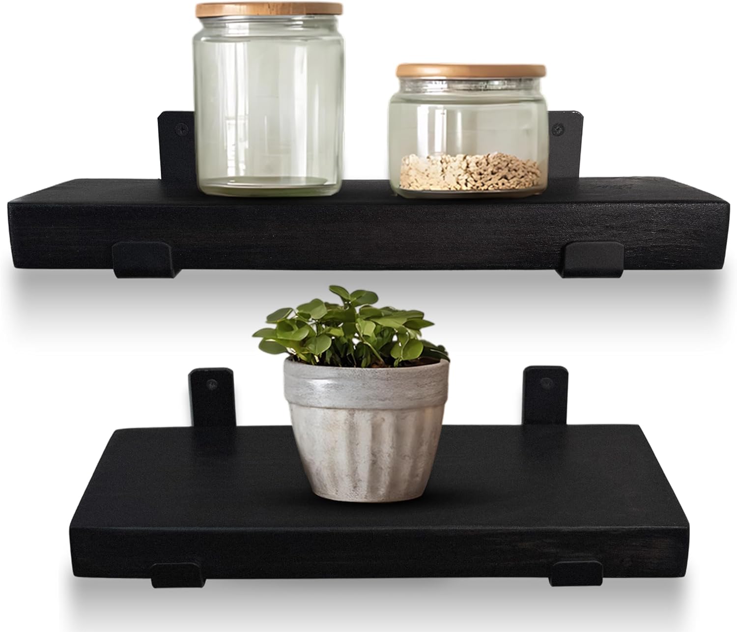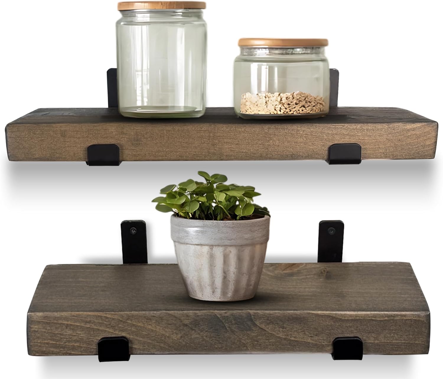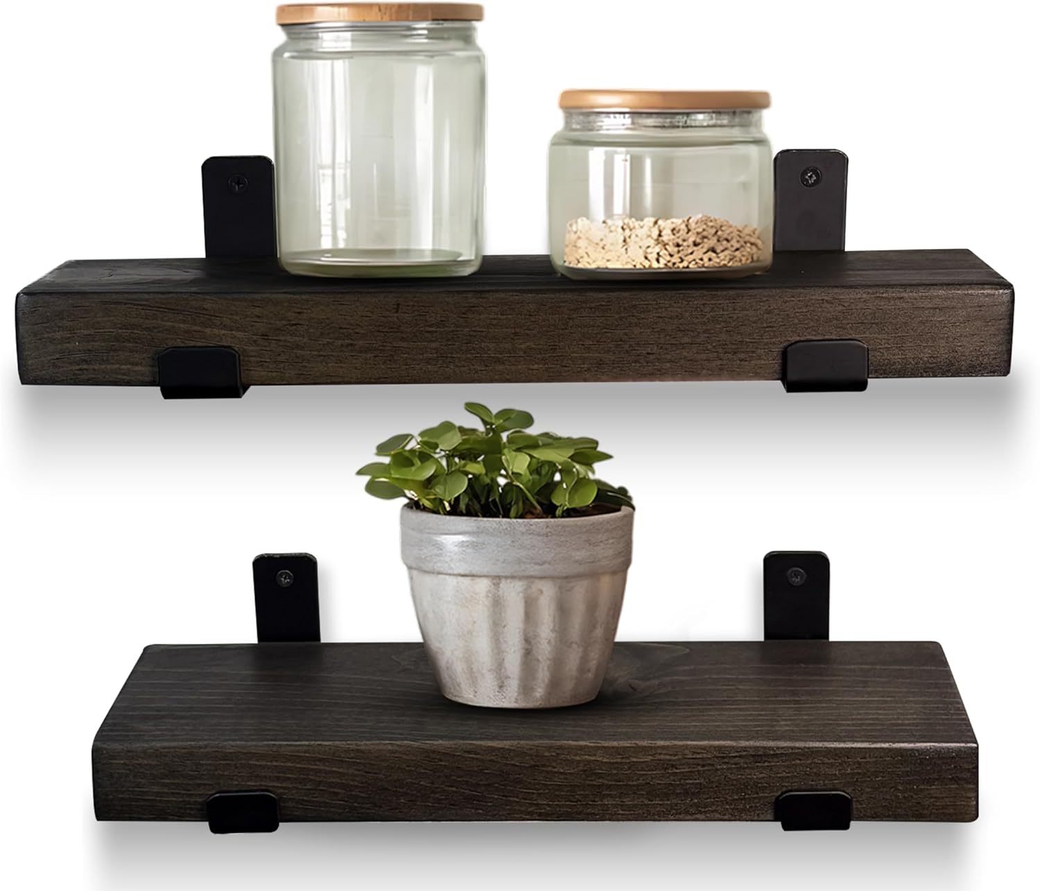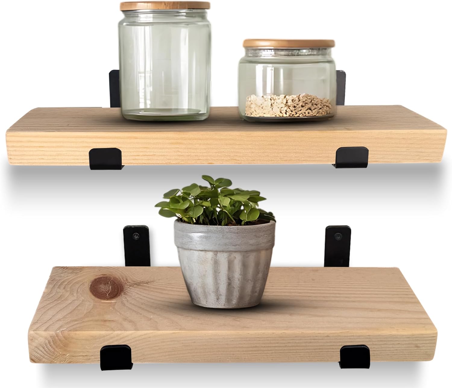 Transform your space with the perfect balance of rustic charm and modern design. This handcrafted wooden shelf for wall is made from solid pine hardwood, carefully selected for its 1.75” thickness, natural grain patterns, and distinctive knots that make every piece one of a kind. Paired with durable matte black steel J brackets, the wood shelves for wall offers a clean, industrial-inspired style that complements both contemporary and farmhouse interiors. More than just stylish, this pine wall shelf is built to last. Each unit is heavy-duty and supports up to 40 lbs per stud, making it a practical choice for holding everything from cookbooks and dinnerware in the kitchen, to toiletries in the bathroom, or framed photos and plants in your living room. With its strong pine construction and secure bracket design, you’ll enjoy a shelf that is both functional and eye-catching. To fit seamlessly into any décor, you can choose from multiple finish options that highlight the wood’s natural beauty, or opt for the unfinished version if you’d like to customize it with your own stain or paint. Whether you’re aiming for a rustic farmhouse look or a sleek industrial vibe, this shelf adapts easily to your style. Installation is simple and straightforward, with everything you need included: 1 handcrafted pine shelf, 2 matte black J brackets, and mounting screws. All you’ll need on your end is a tape measure, stud finder, pencil, level, and drill. With its blend of durability, beauty, and versatility, this handcrafted pine wood shelves is an easy upgrade that elevates any room.